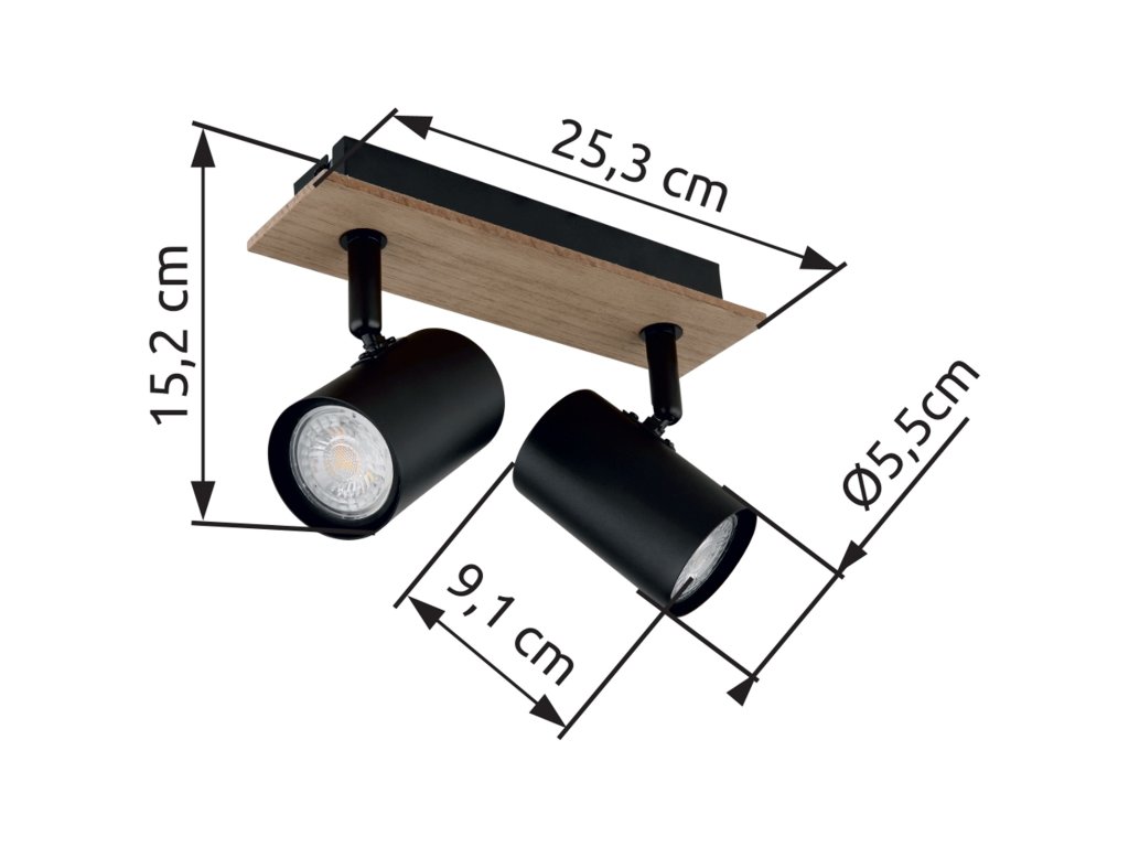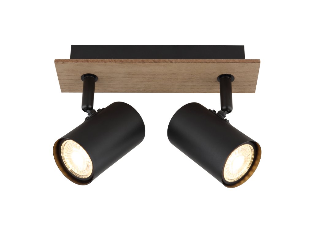 Nástěnné svítidlo, kov černý matný, MDF imitace dřeva, DxŠxV:22x6x15,2cm, bez žárovek 2xGU10, max. 35W 230V.