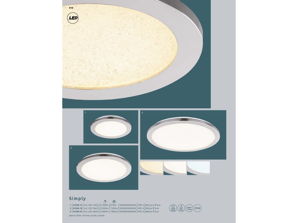 Stropní svítidlo, chrom, plast satin, akrylové průhledné křišťály, změna barvy světla pomocí nástěnného vypínače (bez fixace), IP44, průměr 30 cm, výška 3 cm, včetně 1xLED 18W 230V, 1200lm, změna barvy světla 3000-4000-6500K.