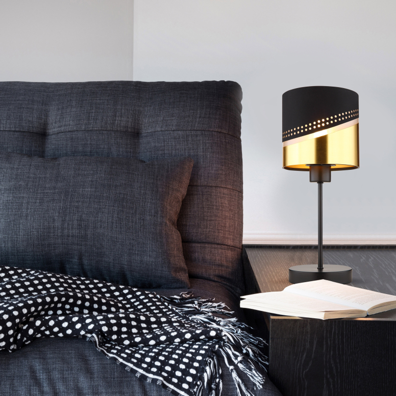 Stolní lampička, kov černý, textil černý, plast zlaté barvy, kabel PVC černý, kolébkový vypínač na kabelu, průměr 160 mm, výška 380 mm, délka kabelu 1500 mm, bez žárovky 1xE27, max. 40W 230V