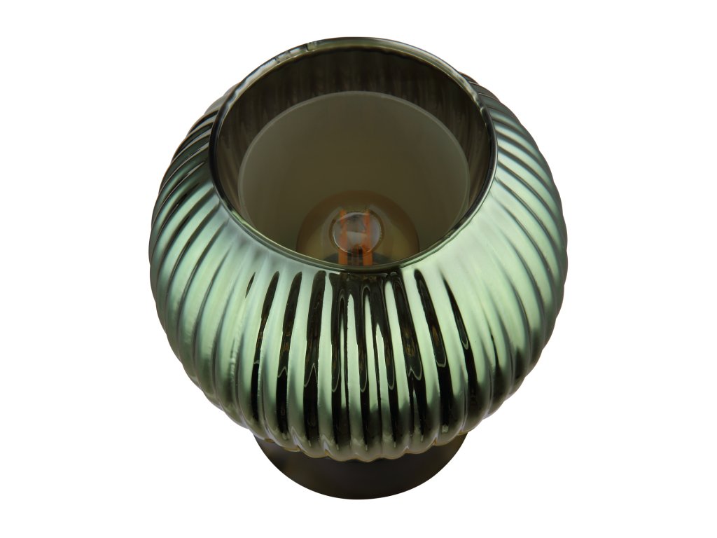 Stolní lampička, kov černý matný, skleněná koule zelená, vnitřní sklo bílé, kabel PVC černý, kolébkový vypínač na kabelu, průměr 150 mm, výška 170 mm, délka kabelu 1500 mm, bez žárovky 1xE27, max. 25W 230V