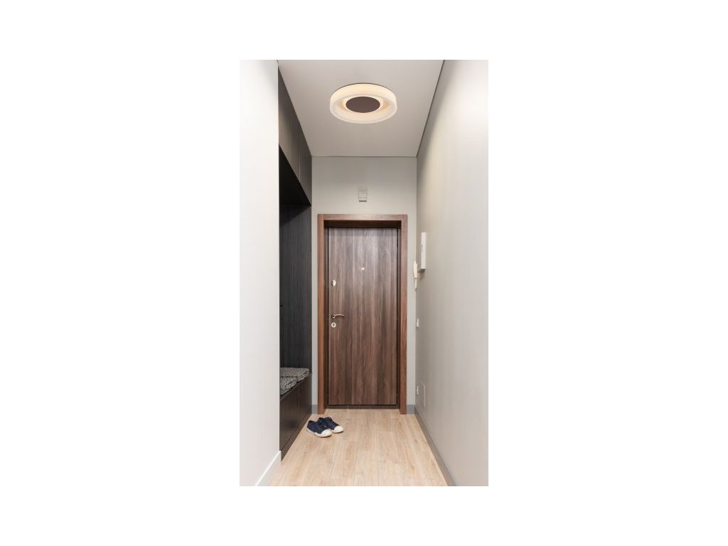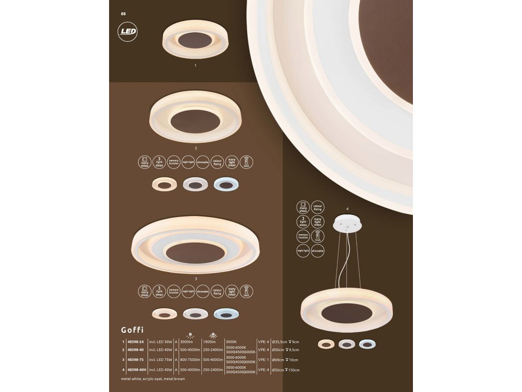 Toto kulaté stropní svítidlo GOFFI (průměr 35,5 cm) nabízí kombinaci bílého kovu, opálového akrylového skla a hnědého kovu uprostřed. S přiloženým 30 wattovým LED světelným zdrojem poskytuje svítidlo 1900 lumenů silného světla. Přesvědčí příjemnou teplou barvou světla 3000 Kelvinů. Světlo lze úžasně integrovat do vaší ložnice, chodby a obývacího prostoru. S dalšími modely této řady můžete svůj obývací prostor dále zkrášlit.