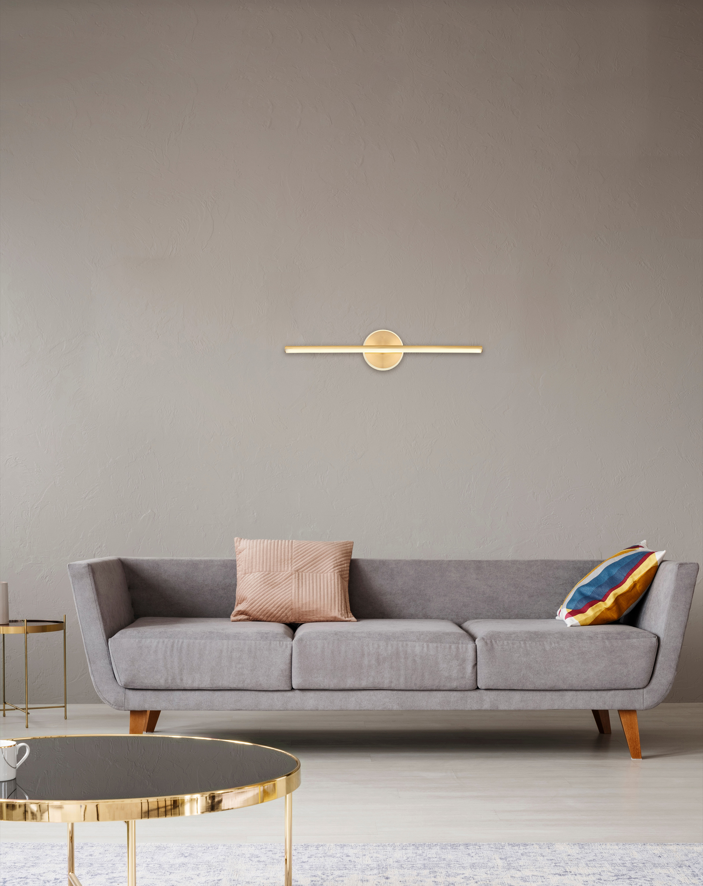 Moderní nástěnné svítidlo je ideální do každého vašeho pokoje. Z kulatého kovového svítidla ve zlaté barvě na stěnu vyčnívá kulatý LED panel s přesahem 74 cm, na kterém je umístěn LED panel o délce 61 cm. Tyto poskytují neutrální světlo 4000 Kelvinů a mají stupeň ochrany IP44 proti stříkající vodě.