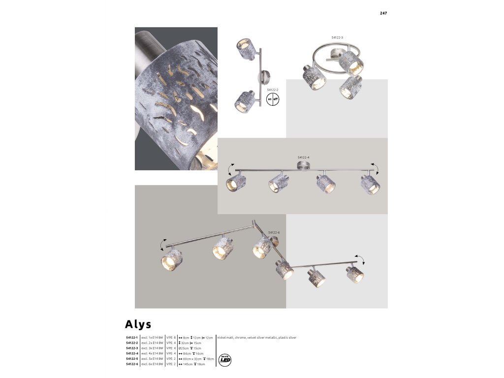 Stylová a elegantní řada bodových svítidel Alys jednoznačně boduje kombinací materiálů. Bodová svítidla ALYS jsou pokryta stříbrným sametem, který skvěle ladí se stříbrným vnitřkem reflektorů a poskytují krásné světlo. Matný niklový kov držáku a jednotlivé chromované části dotvářejí obraz a činí z tohoto reflektoru opravdový poutač. Bodová světla mají každý patici E14, která umožňuje sami určit zdroj světla a tím i intenzitu světla a barvu světla (max. 8W). obraz ve svých prostorách můžete doplnit dalšími modely této řady.