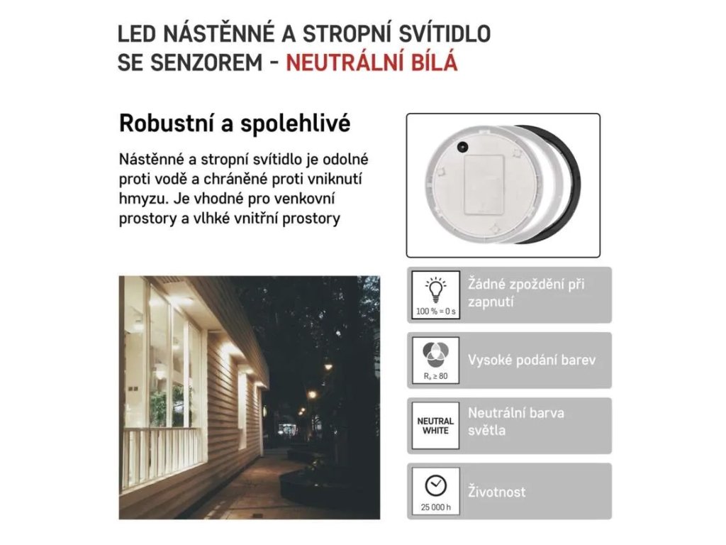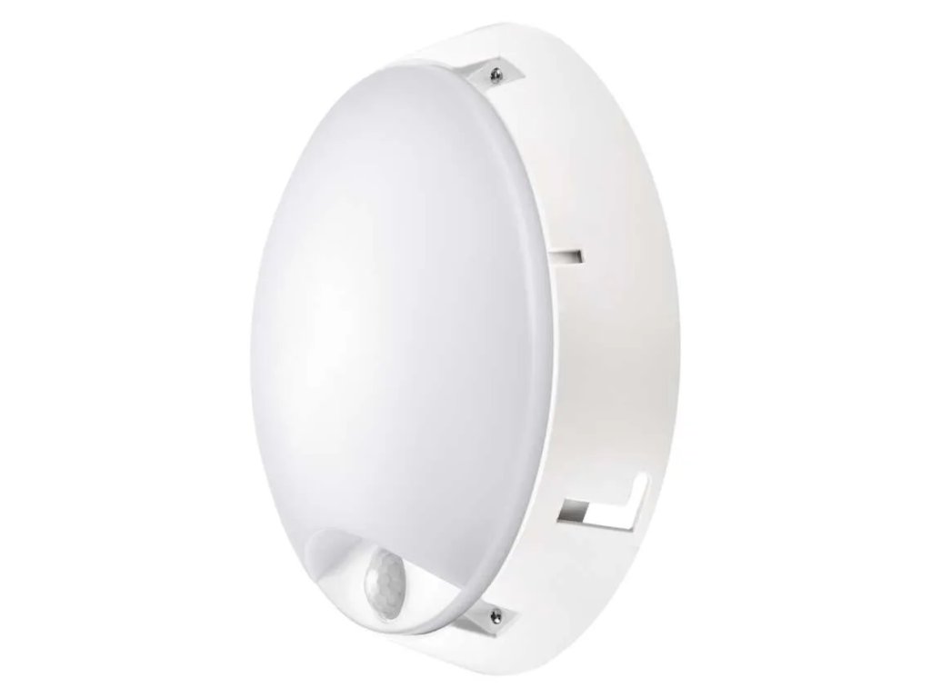 Můžete jej mít v celkem osmi variantách dle barvy, tvaru, stupně krytí, funkce, nebo barvy světla. Přisazené svítidlo má klasický kruhový tvar a uvnitř ukrývá moderní, velmi úsporné a trvanlivé LED diody s vysokým výkonem. Životnost svítidla je predikována na 25 000 hodin. Během nich vám bude krycí mléčný difuzor posílat světlo rovnoměrně a příjemně v širokém úhlu 120°. Výhodou oblíbeného svítidla je vysoký stupeň krytí. Svítidlo je tak vhodné do prostor s vysokou vlhkostí. Model je také vybaven chytrým PIR čidlem pohybu, který svítidlo aktivuje jen, když je třeba.