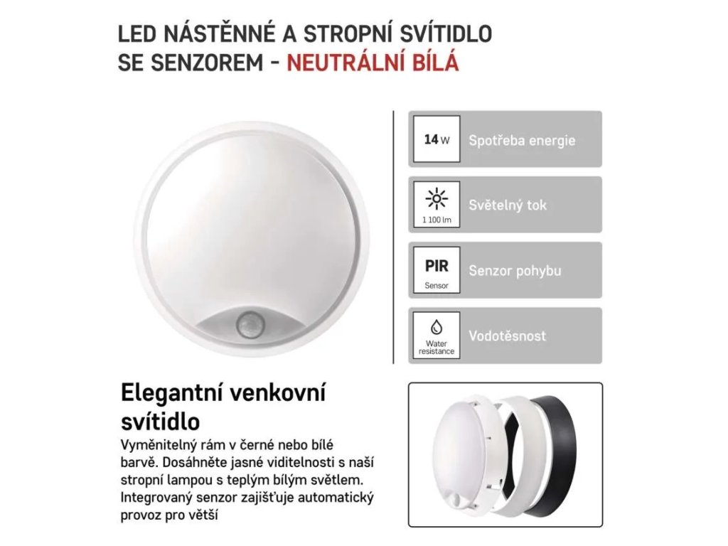 Můžete jej mít v celkem osmi variantách dle barvy, tvaru, stupně krytí, funkce, nebo barvy světla. Přisazené svítidlo má klasický kruhový tvar a uvnitř ukrývá moderní, velmi úsporné a trvanlivé LED diody s vysokým výkonem. Životnost svítidla je predikována na 25 000 hodin. Během nich vám bude krycí mléčný difuzor posílat světlo rovnoměrně a příjemně v širokém úhlu 120°. Výhodou oblíbeného svítidla je vysoký stupeň krytí. Svítidlo je tak vhodné do prostor s vysokou vlhkostí. Model je také vybaven chytrým PIR čidlem pohybu, který svítidlo aktivuje jen, když je třeba.