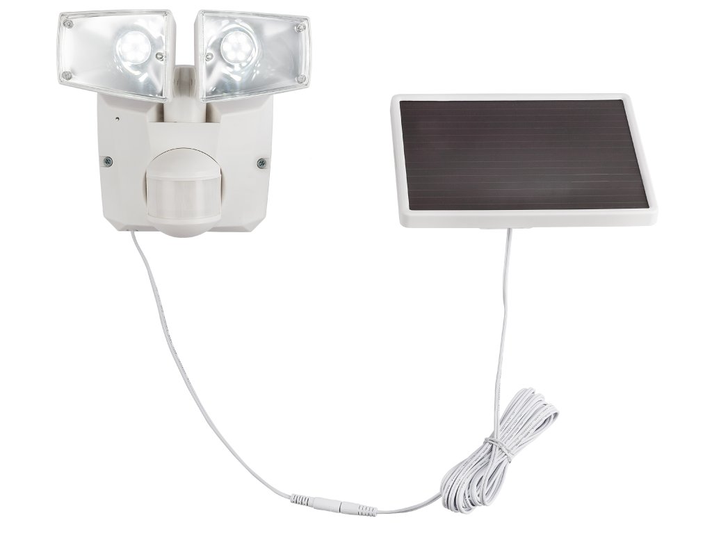 Solární svítidlo, plast, bílá, průhledná, kabel 5m, IP44, vypínač, senzor: 180 °, dosah: 12m, 4x1800mAh Ni-Mh, 190x190 mm, hloubka 110 mm, vč.2xLED 3W 3,2V, 209lm, 6500K.