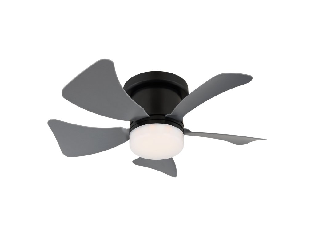 Stropní ventilátor, kov černý matný, plast šedý/bílý, stmívatelný, několik úrovní pomocí nástěnného spínače, dálkové ovládání, 15m2, průměr : 40cm, výška: 13cm, včetně LED 9W 230V, zdroj 1000lm, výstup 800lm, CCT 2700-6500K.