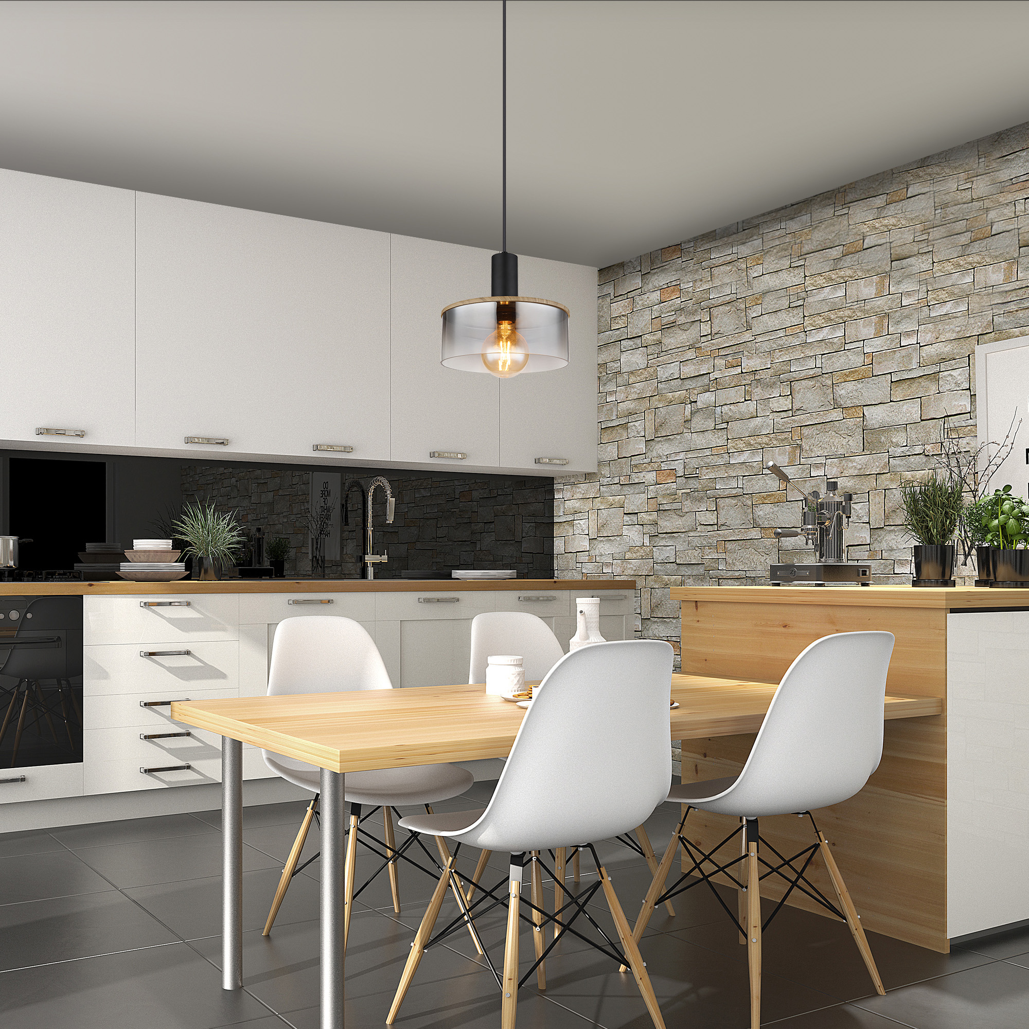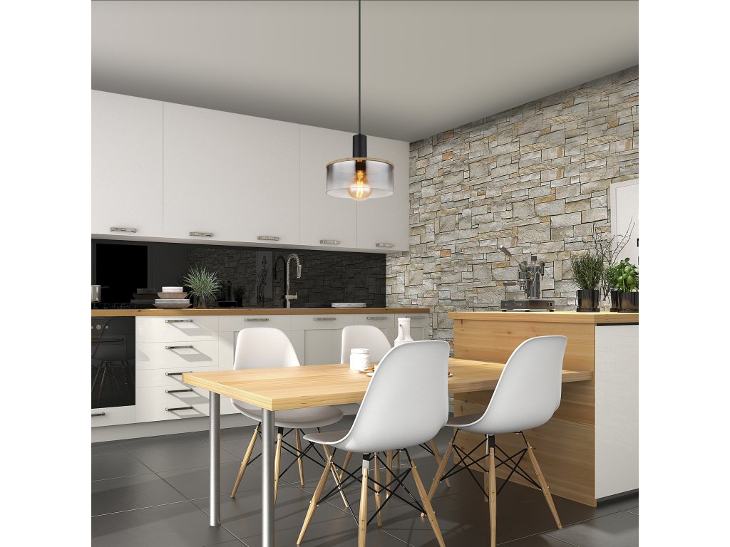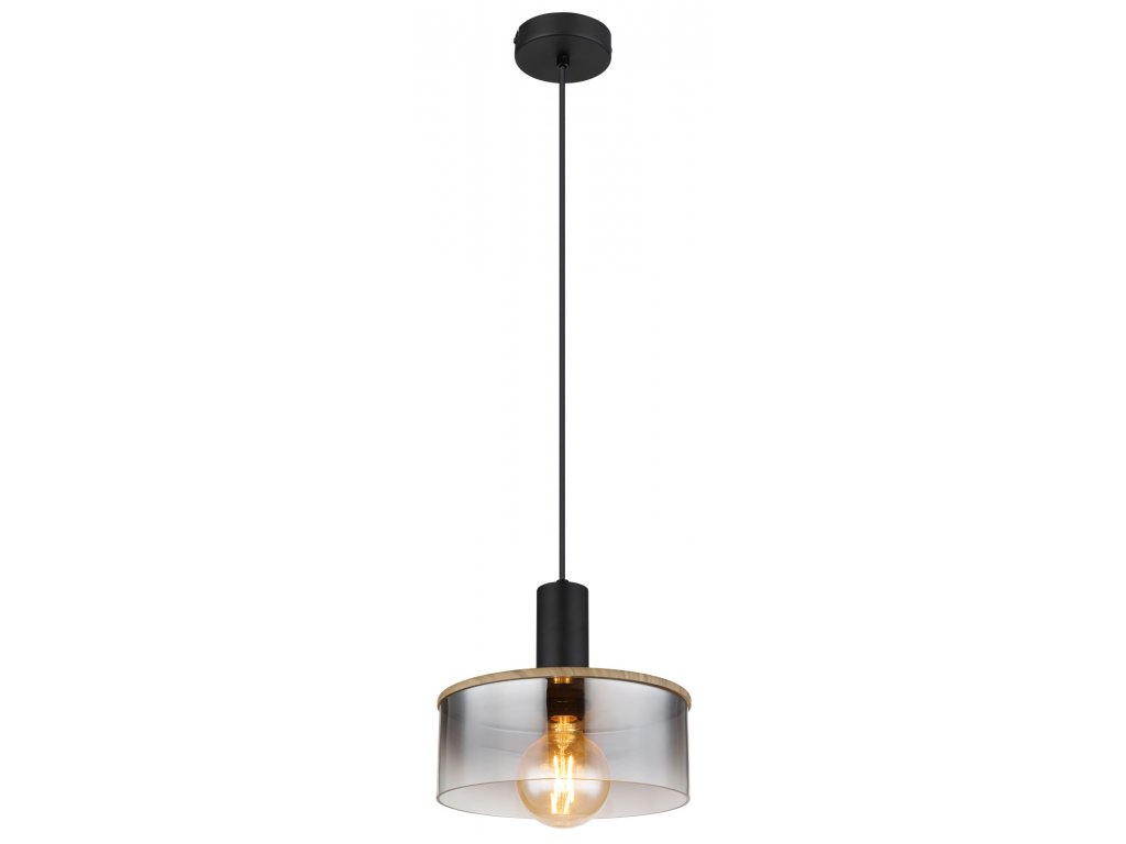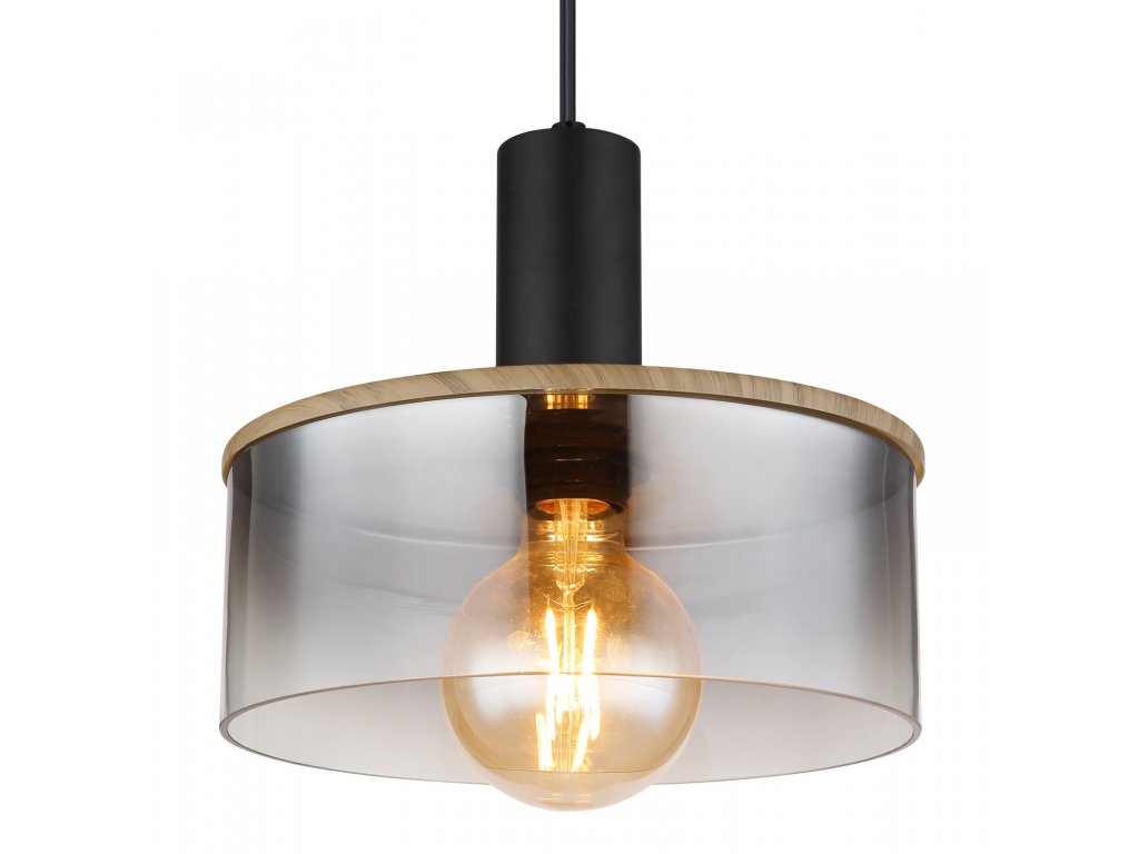 Jednoduché závěsné svítidlo přesvědčí svým tvarovým designem. Od kulatého stropního svítidla vede černý kabel o délce 1,2 m k zásuvce E27, která je překryta stínidlem válcového skla v barvě kouře (průměr 25 cm) s dekory v efektu dřeva. Patice E27 umožňuje sami určit barvu a jas světla až do maximálního výkonu 15 wattů. Z důvodu dlouhé životnosti a úspory energie doporučujeme LED žárovky z naší nabídky.