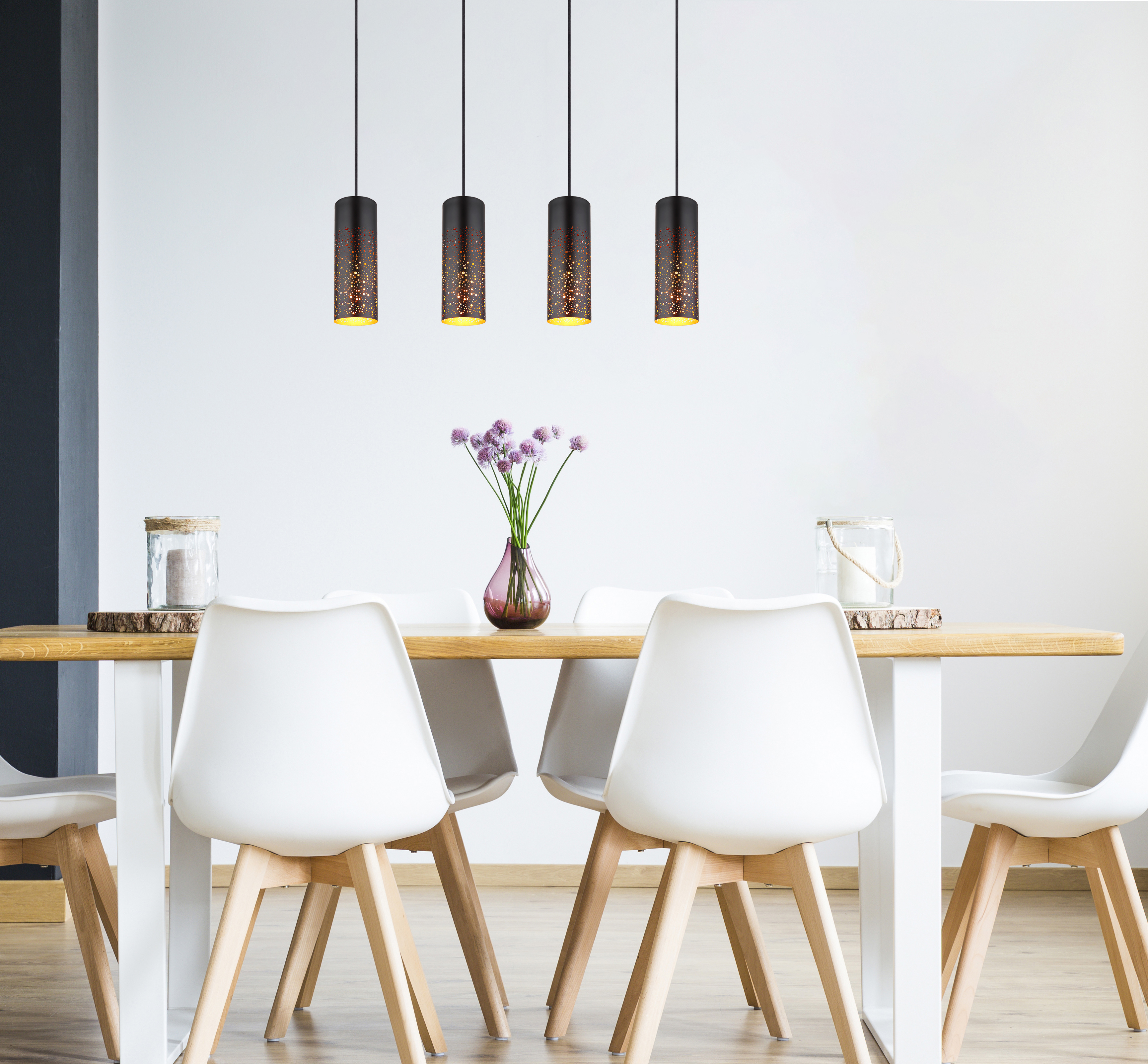 Závěsné svítidlo ze série CROCKY se skládá z černého kovu a cylindrických skel s ozdobným děrováním (průměr 10 cm). Od 80 cm dlouhého stropního svítidla do zásuvky E27 vedou čtyři 1,5 m dlouhé kabely, které jsou opatřeny tvarovými stínidly. Patice E27 umožňuje sami určit barvu a jas světla až do maximálního výkonu 40 wattů. Z důvodu dlouhé životnosti a úspory energie doporučujeme LED žárovky z naší nabídky.