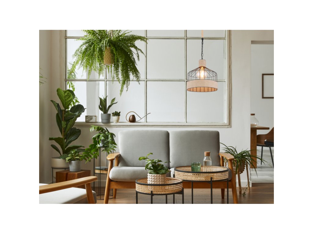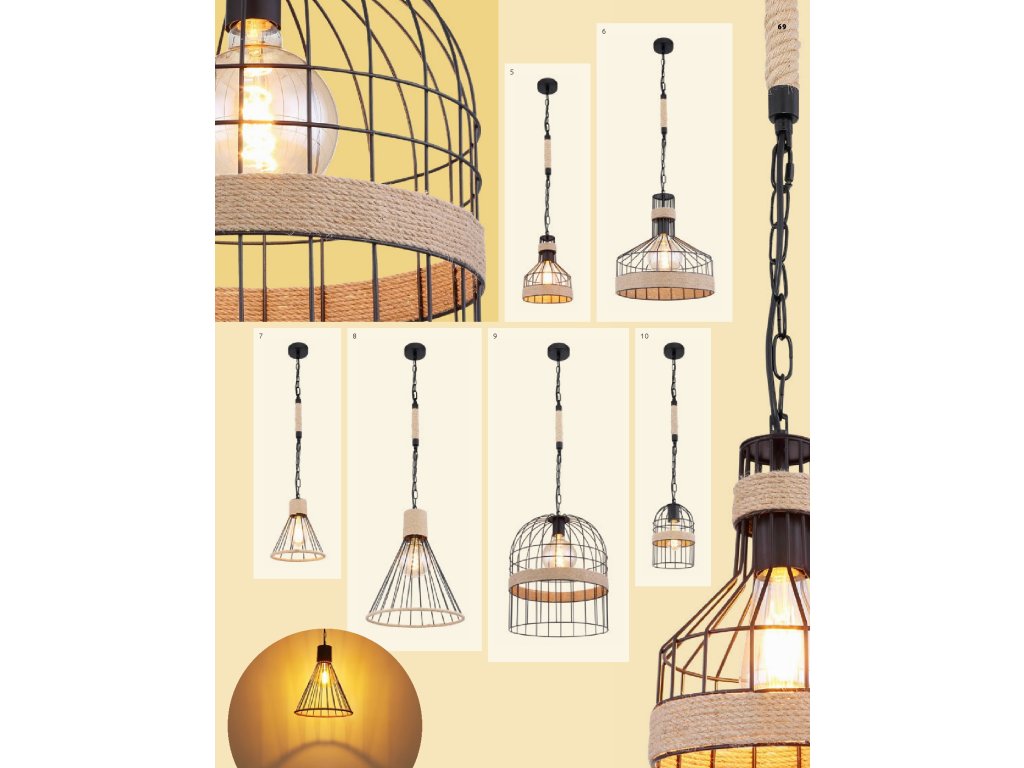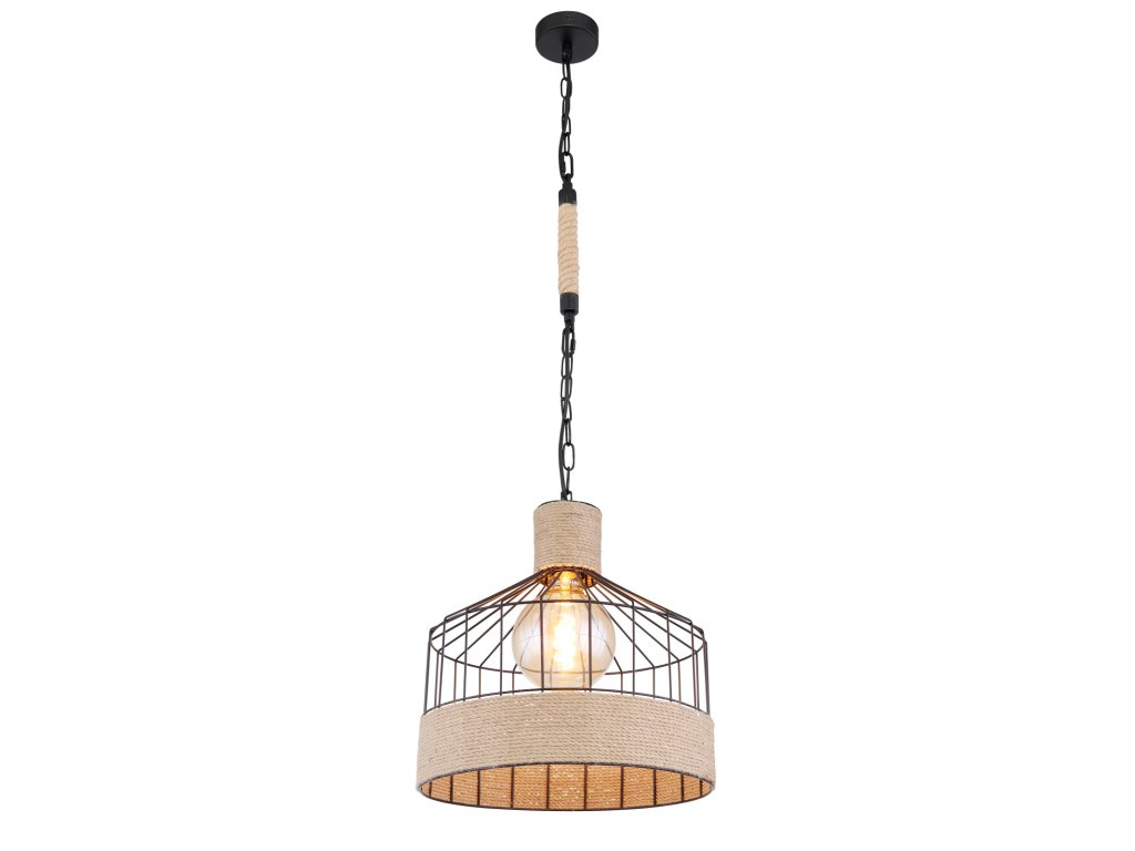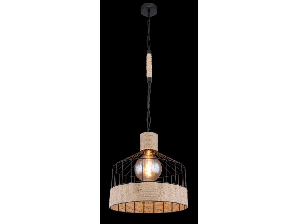 Závěsné svítidlo, kov černý matný, konopné lano hnědé, černý řetěz, průměr 35 cm, výška max. 135 cm, bez žárovky 1xE27, max. 60W 230V.