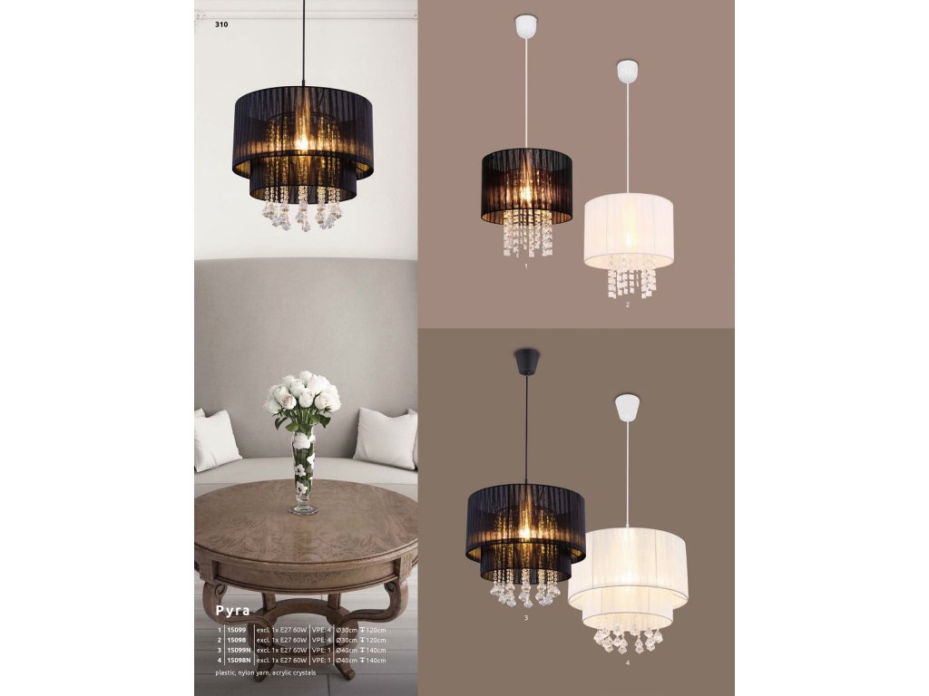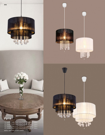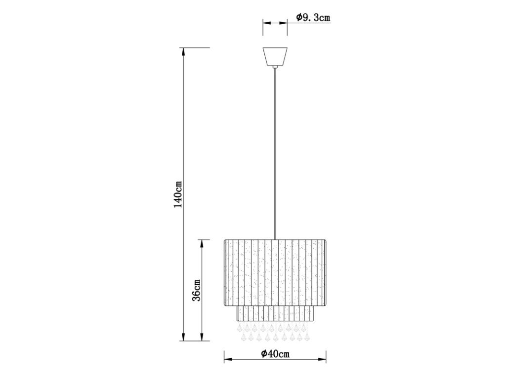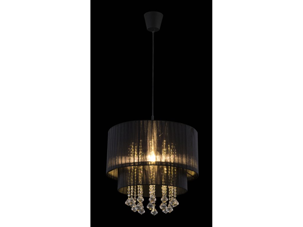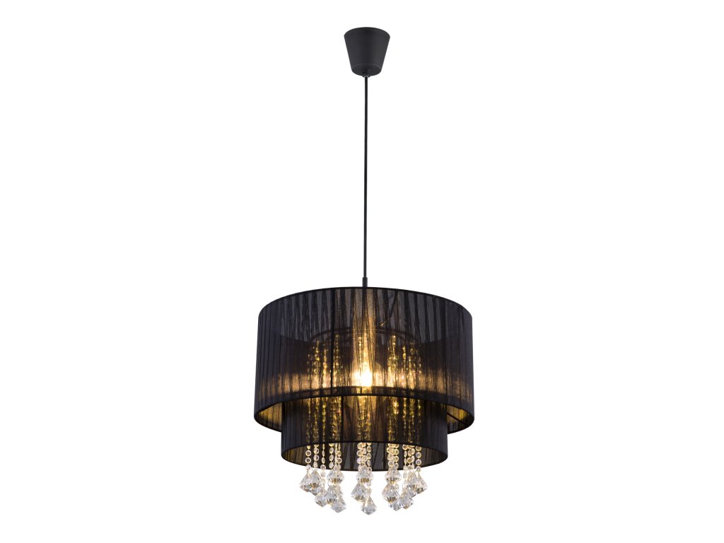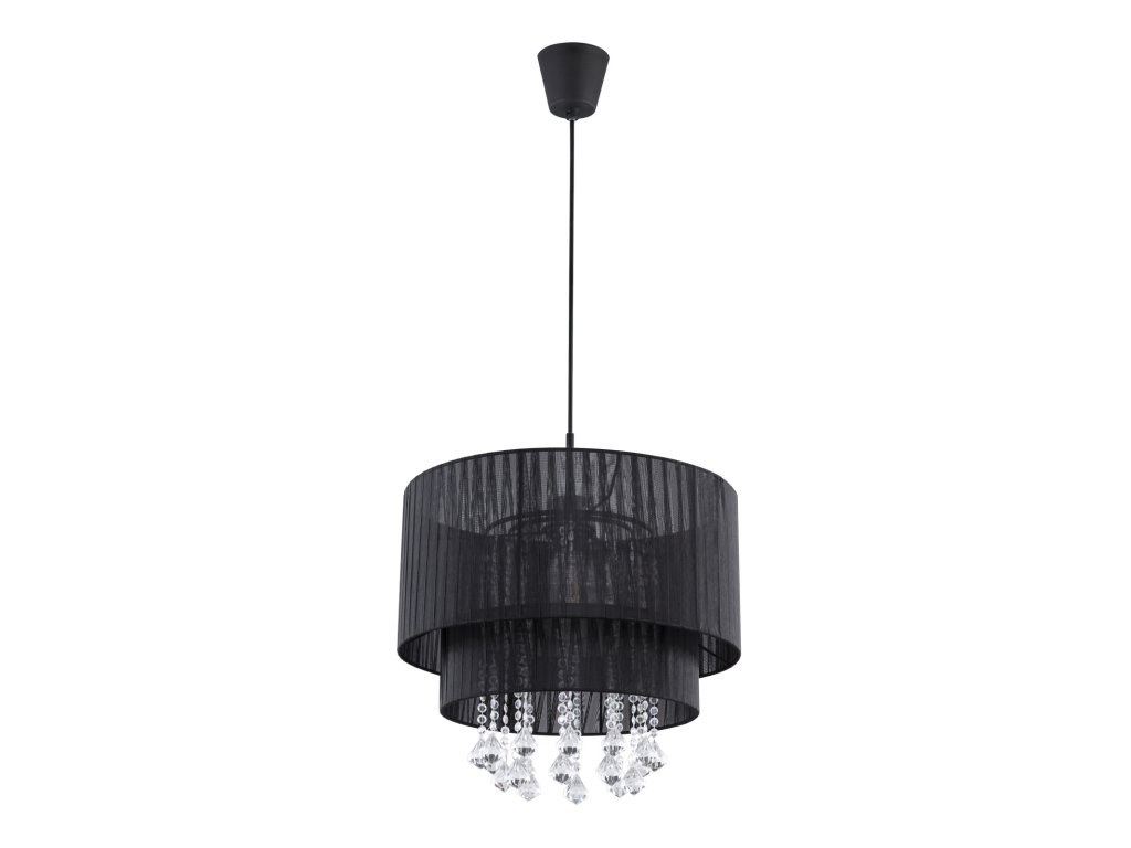 Závěsné svítidlo, černý plast, příze černá, křišťály plastové průhledné, průměr 40 cm, výška max. 140 cm, bez žárovky 1xE27, max. 60W 230V.