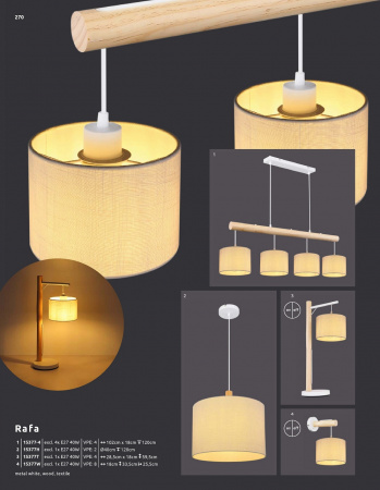 Závěsné svítidlo, bílý kov, dřevo přírodní, textil bílý, textilní kabel.
